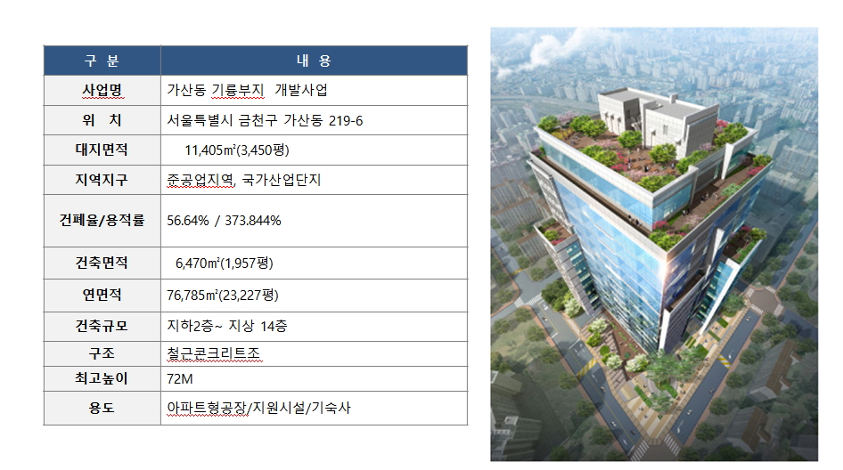 ◈ 건 축 개 요 ◈ |사 업 명: 대륭포스트타워 5차 |대지위치: 서울시 금천구 가산동 60-3 |대지면적: 9,394.00㎡ (2,841.69평) |건축규모: 지하4층~지상20층 |건축면적: 4,128.68㎡ (1,337.67평) |연 면 적: 77,006.40㎡ (23,294..